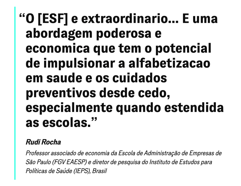 O relatório destaca o papel estratégico da Estratégia Saúde da Família (ESF) como modelo transformador de Atenção Primária. Com mais de 2,9 milhões de visitas domiciliares por ano, a ESF reduz hospitalizações evitáveis e melhora desfechos clínicos de saúde, especialmente entre populações de baixa renda.